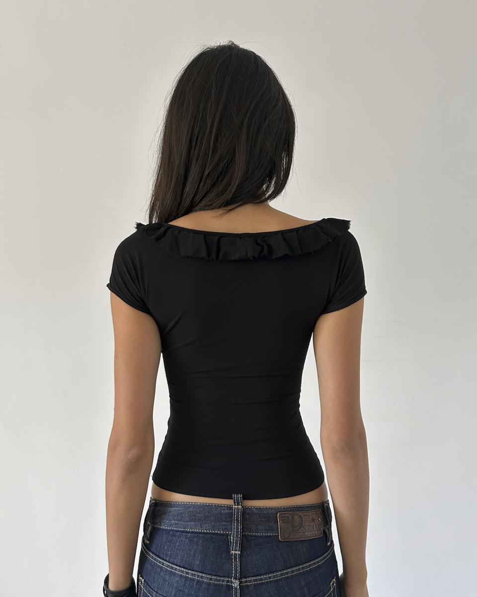 Blumarine Anna Molinari black v-neck top with ruffle front detail
