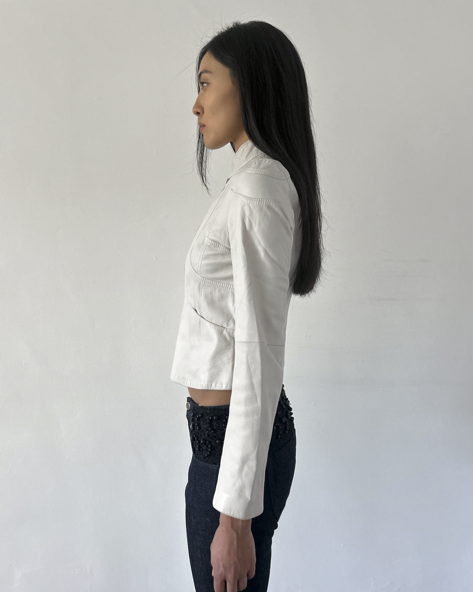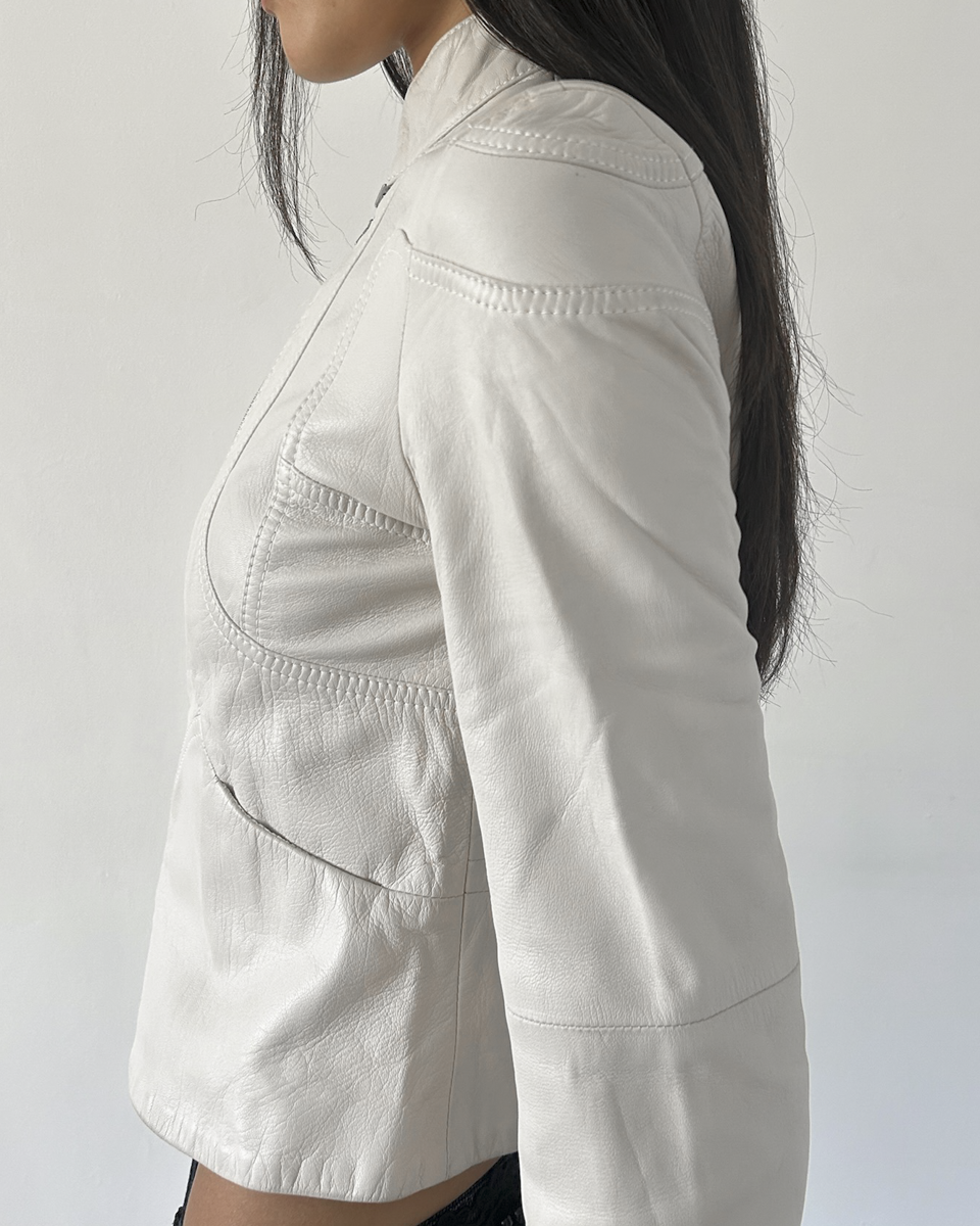 Emporio Armani (2002) beige double zip cropped leather jacket with front pockets