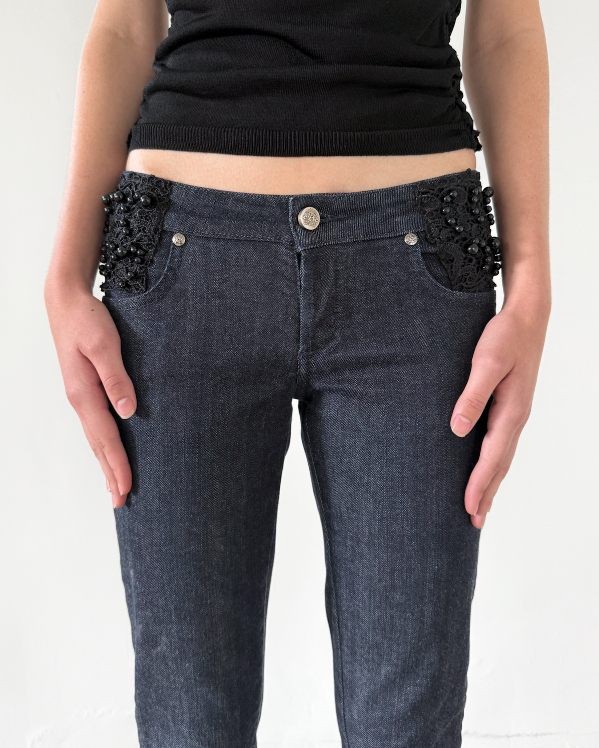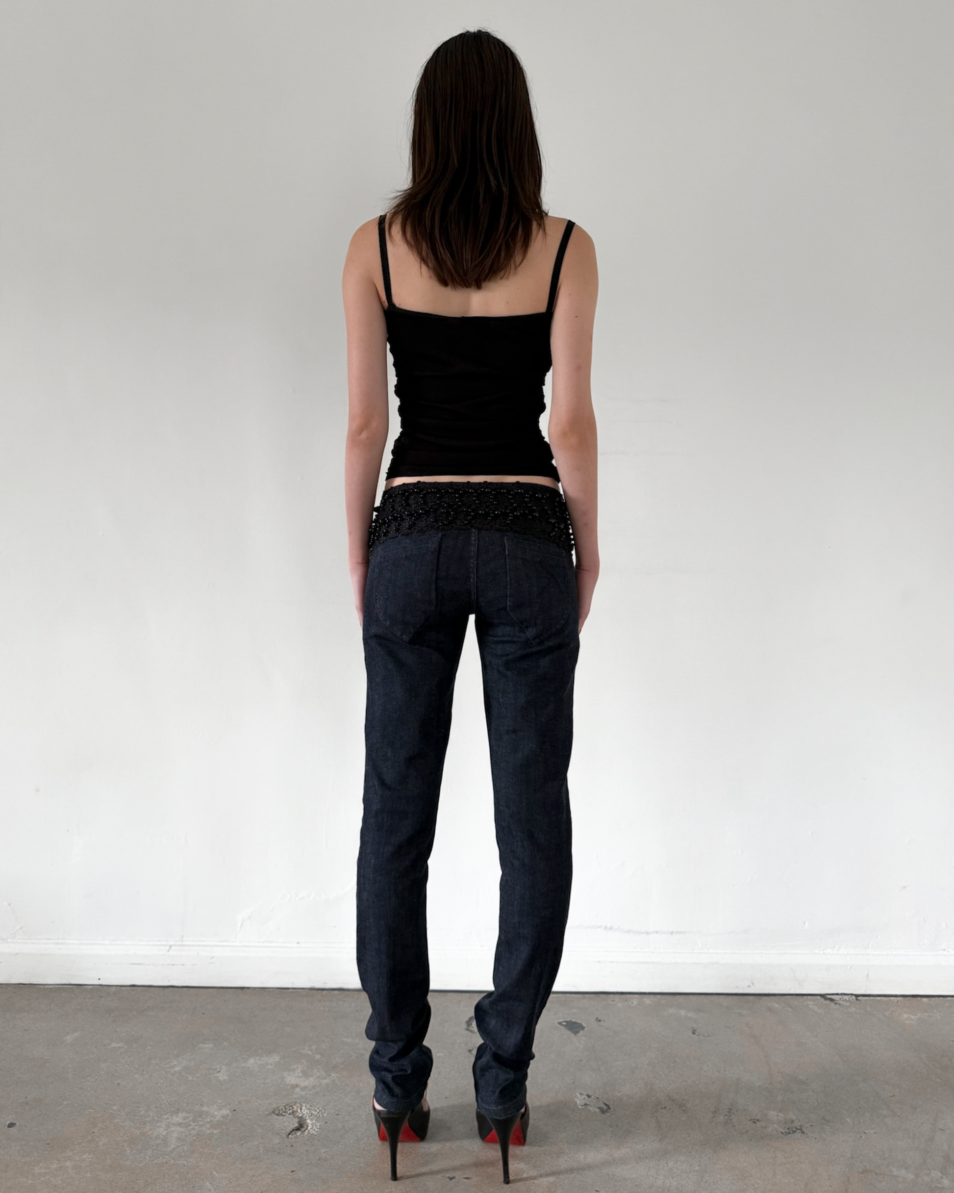 Exte dark wash low rise skinny denim with zipper ankles and black beaded waistband