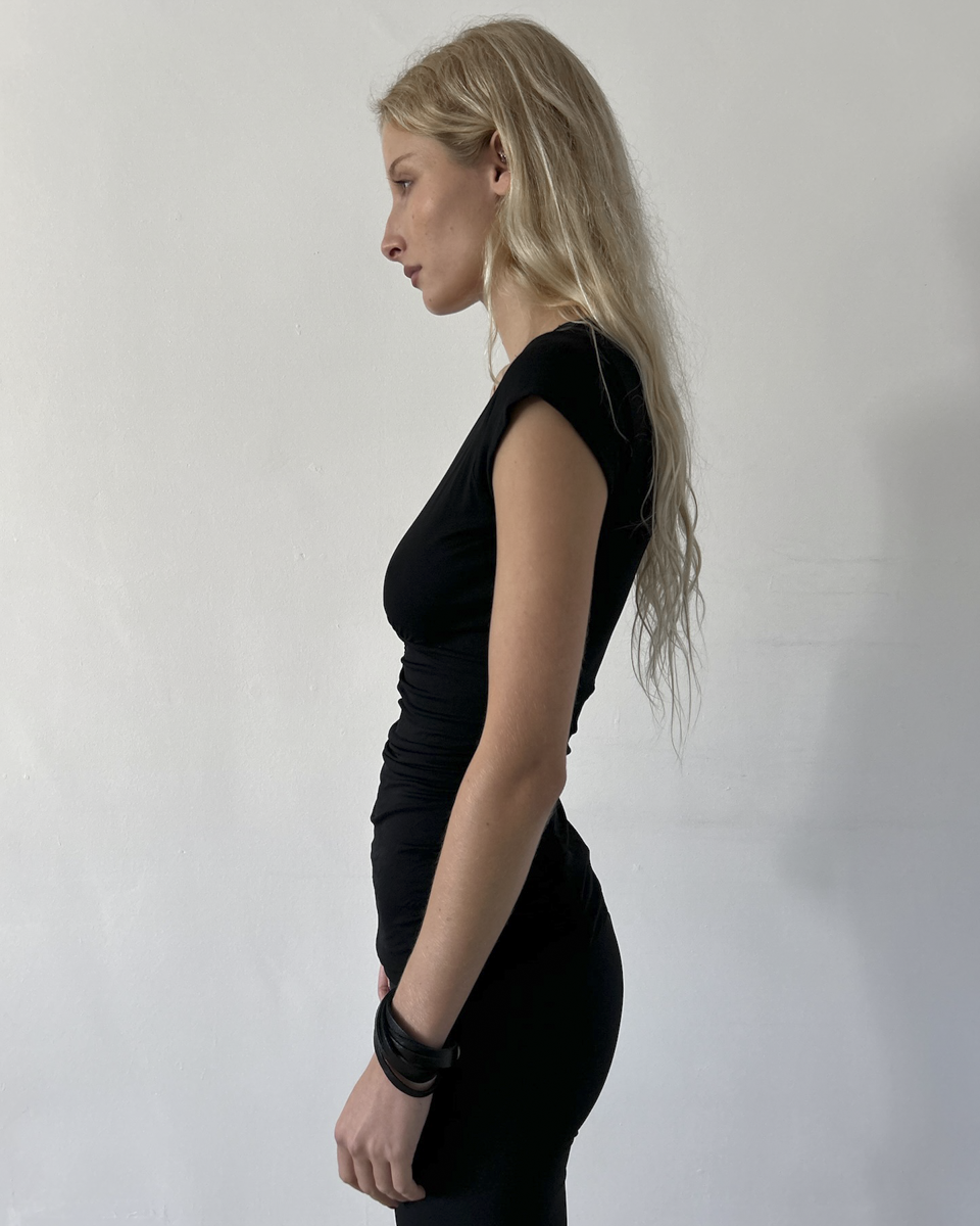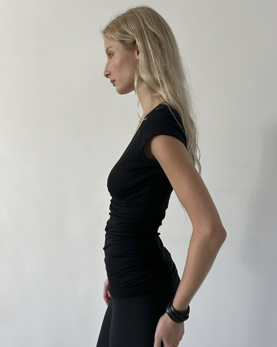 Gucci by Tom Ford black v-neck top with empire waist and front rouging detail