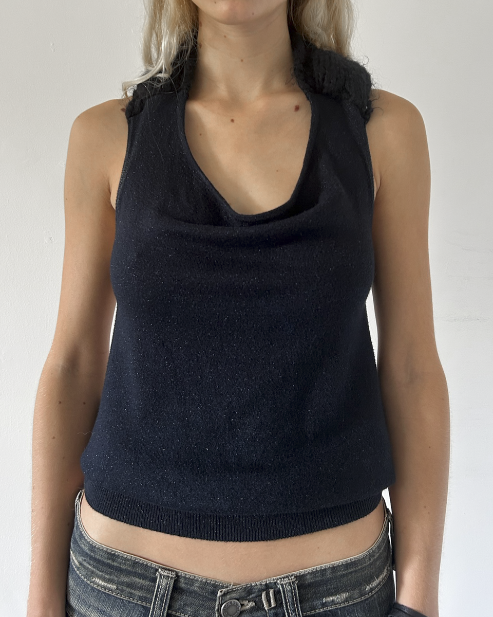 Miss Sixty sparkly navy open-back sleeveless cowl neck top with fur halter piece