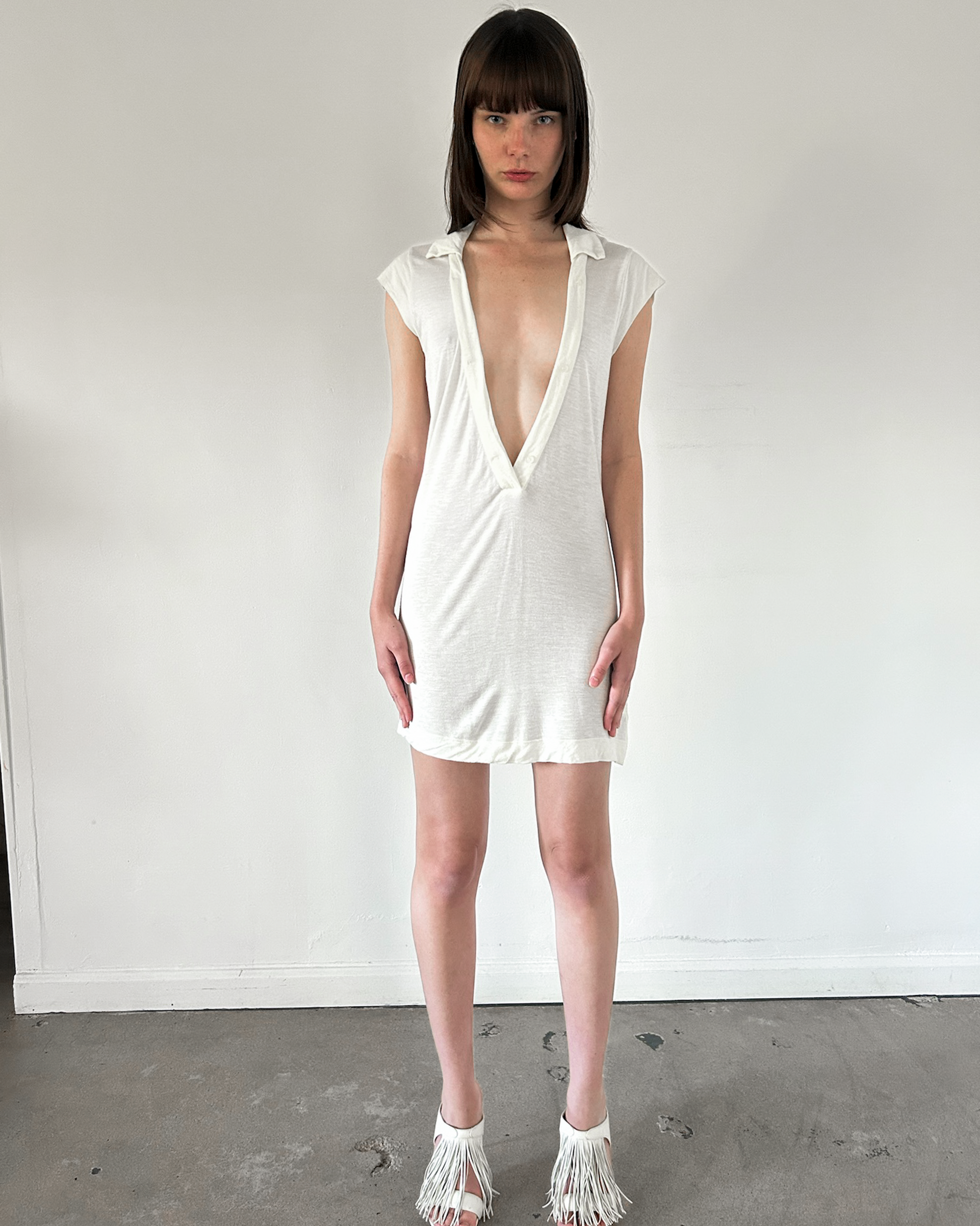MM6 Maison Martin Margiela white v-neck tunic with cap sleeve and button detail.