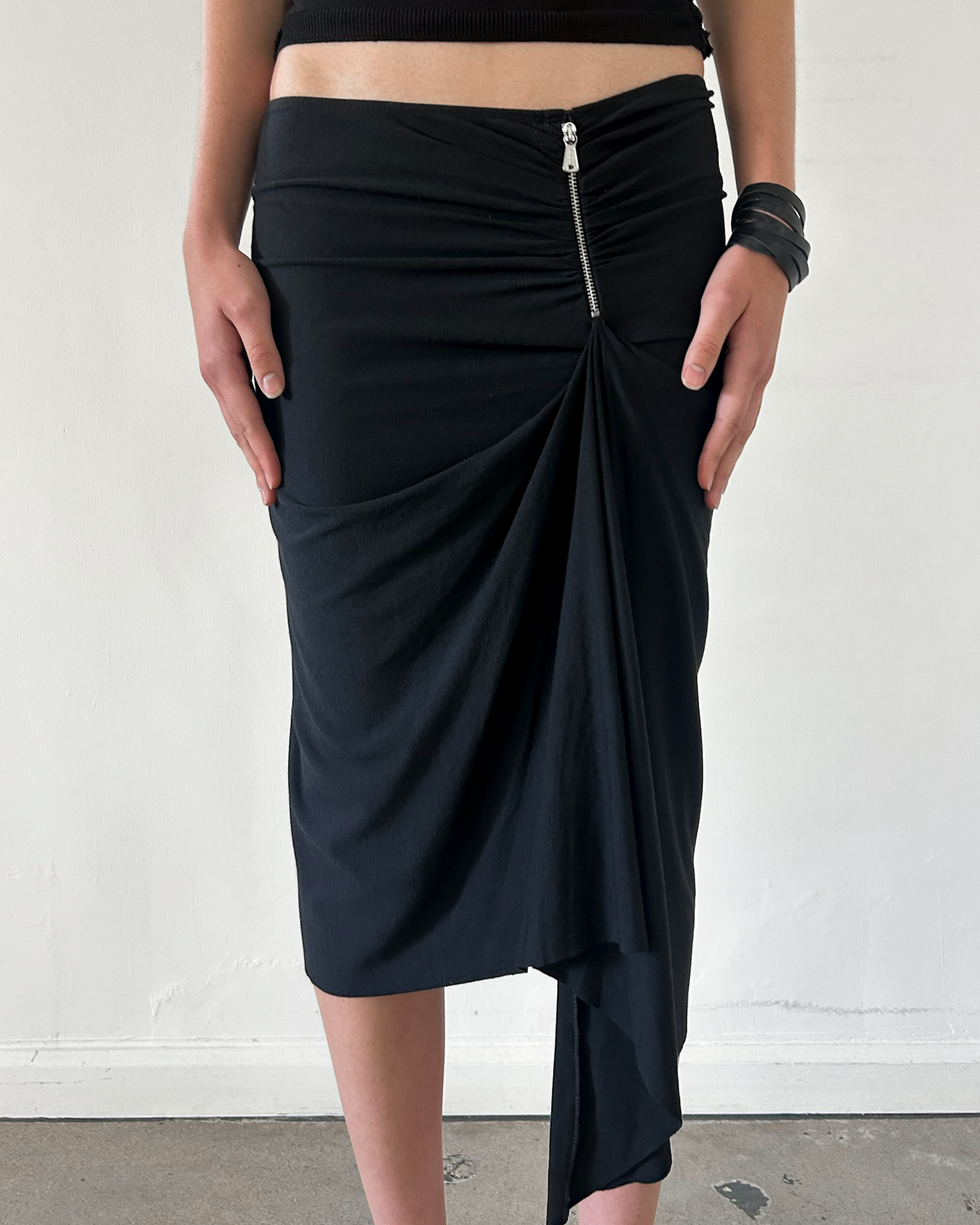 Morgan de Toi black asymmetrical midi skirt with front zipper detail
