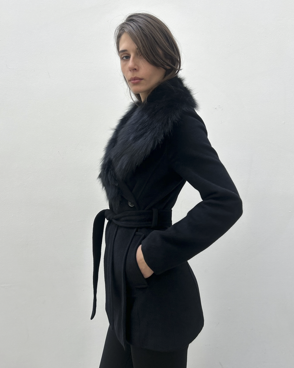 Morgan de Toi black wool coat with genuine fur collar and waist tie