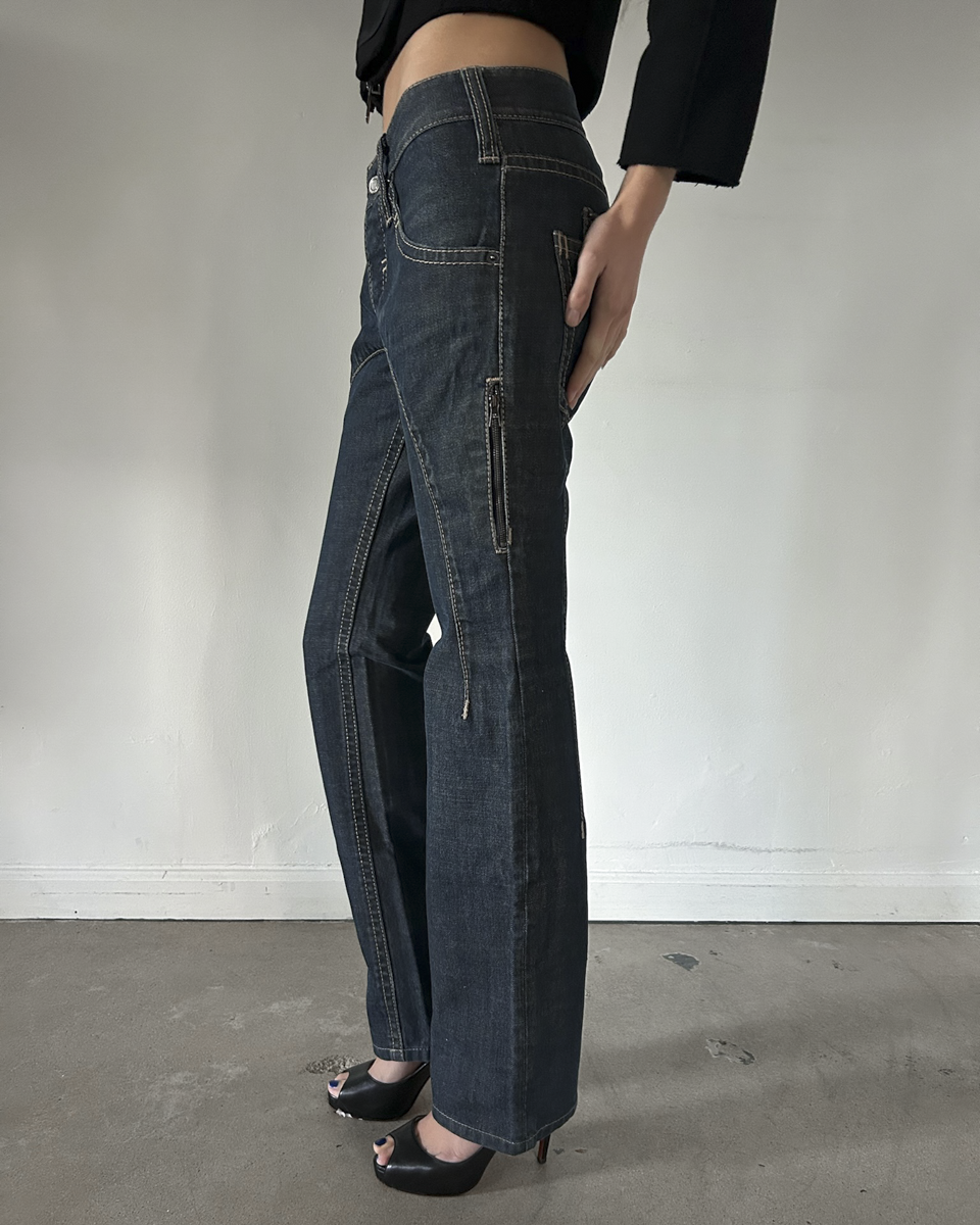 Neil Barrett dark wash low-rise denim with contrast stitching and side zipper pocket