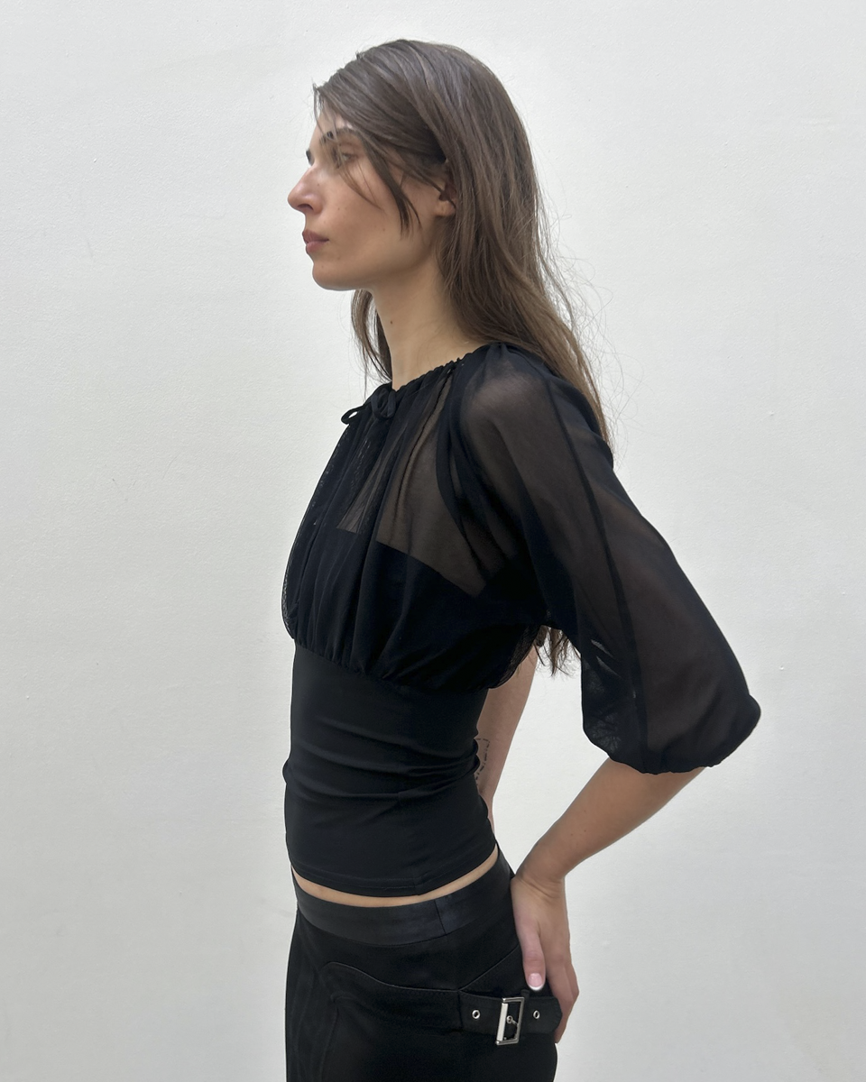 Paola Frani black sheer tulle 3/4 sleeve blouse with front bow tie and fitted tube top underneath