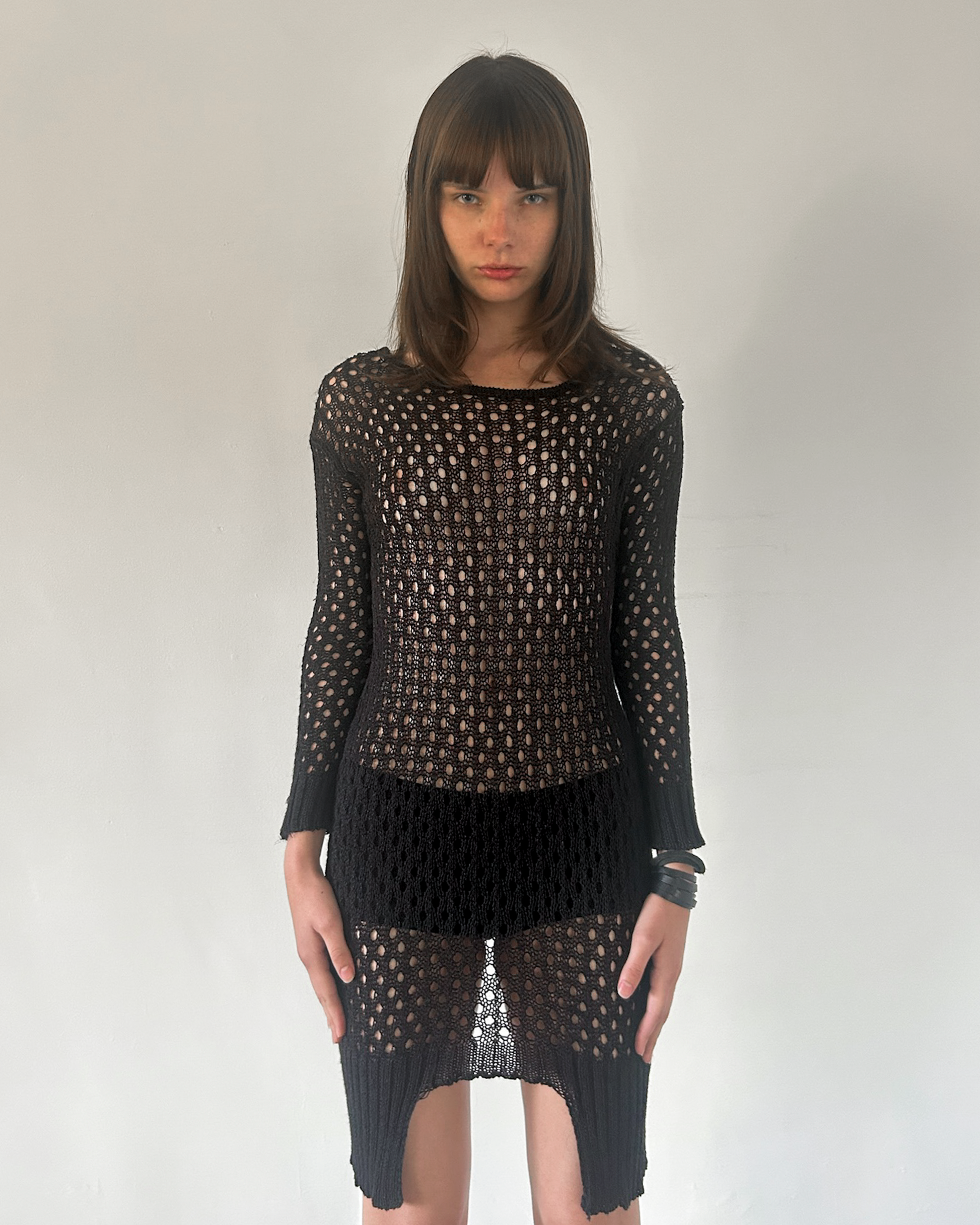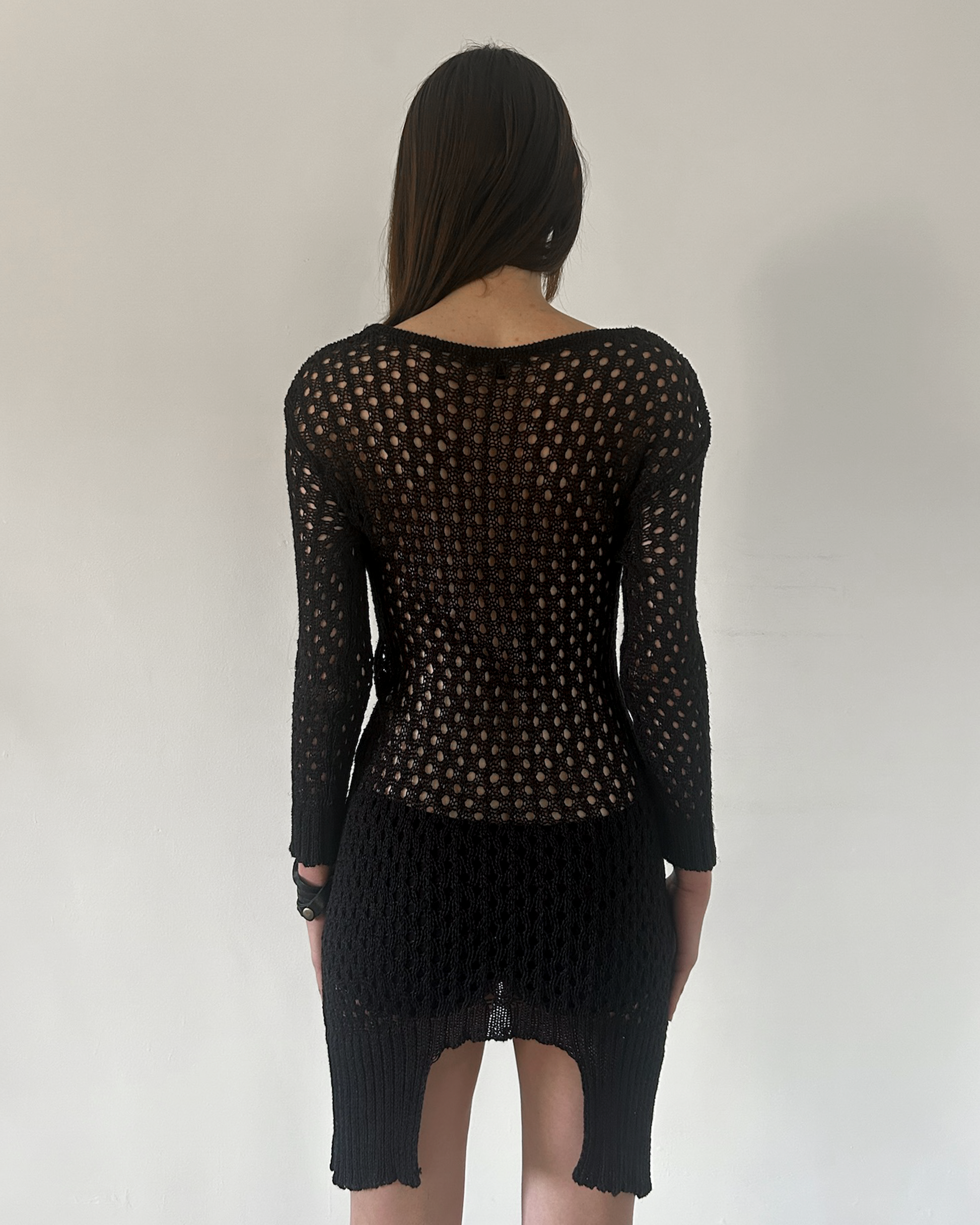 Patrizia Pepe black crochet midi long sleeve dress with asymmetrical hem