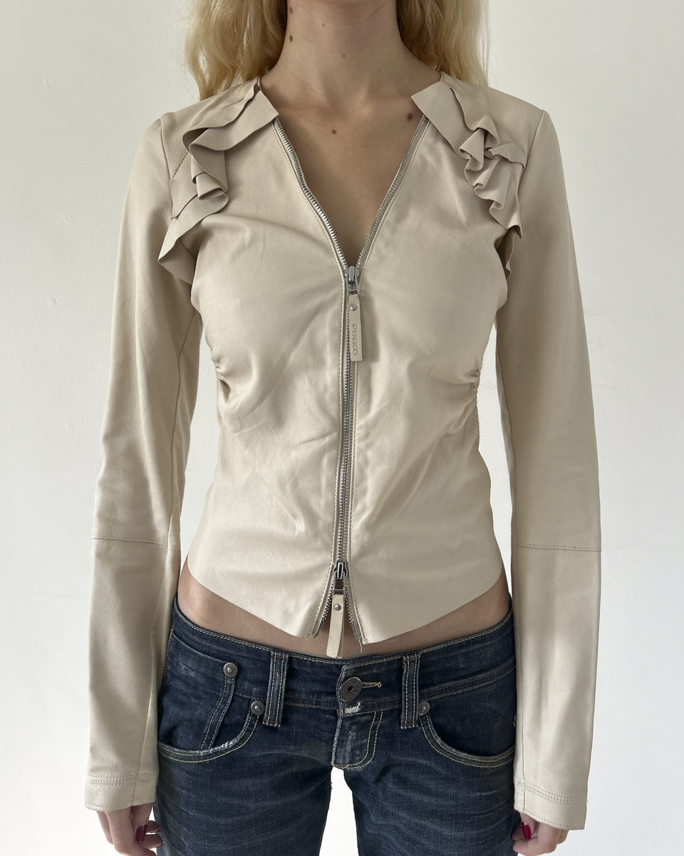 Pinko beige ruffled leather jacket with two way zipper and spandex back