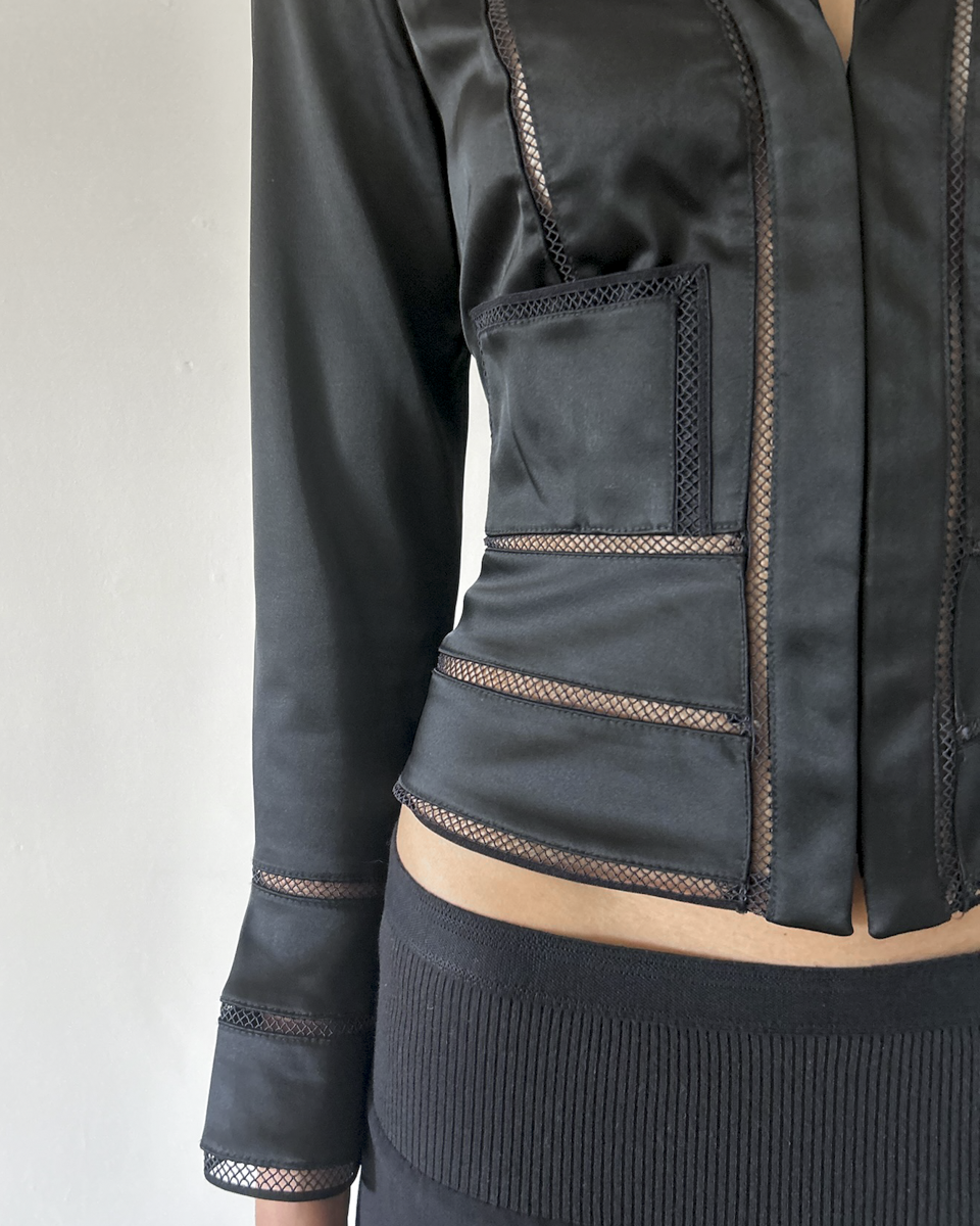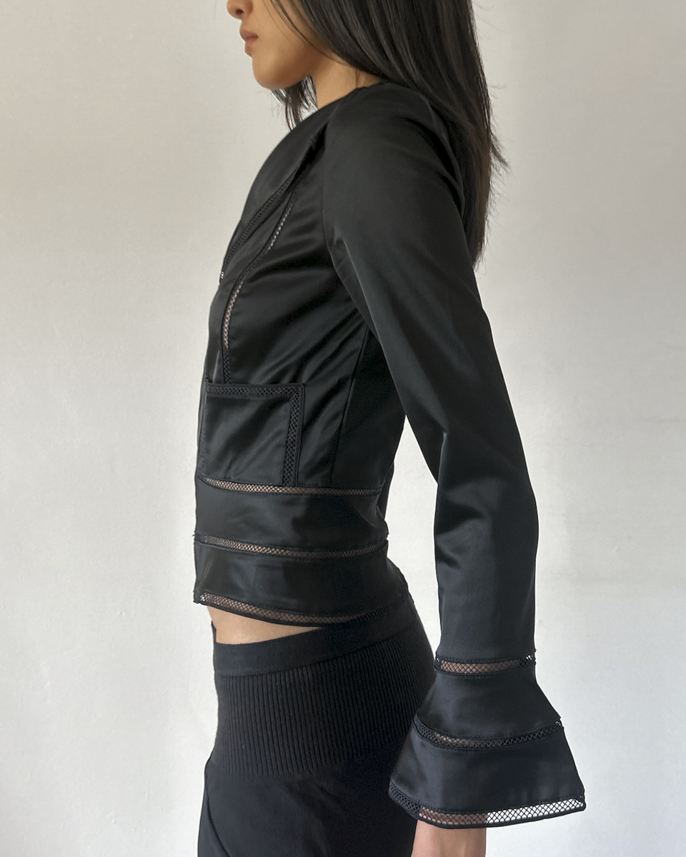 Tadashi Shoji black hook and eye plunge neck blazer with bell sleeves and mesh trim