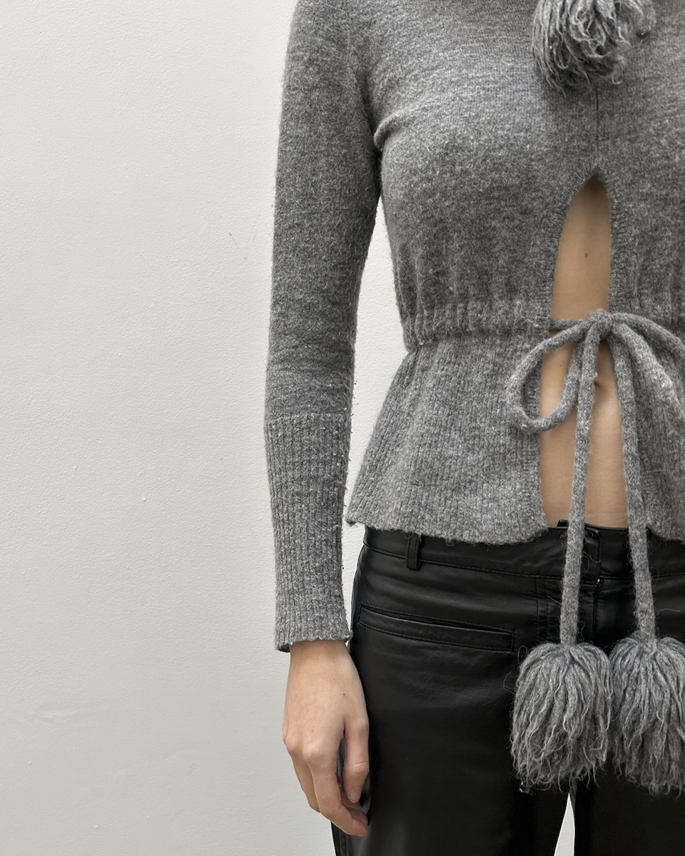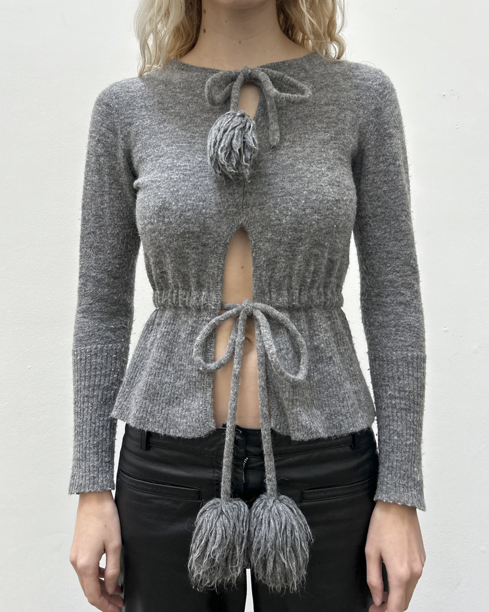 Vivienne Westwood RED Label grey knit cardigan with tie front closure and pompom detail