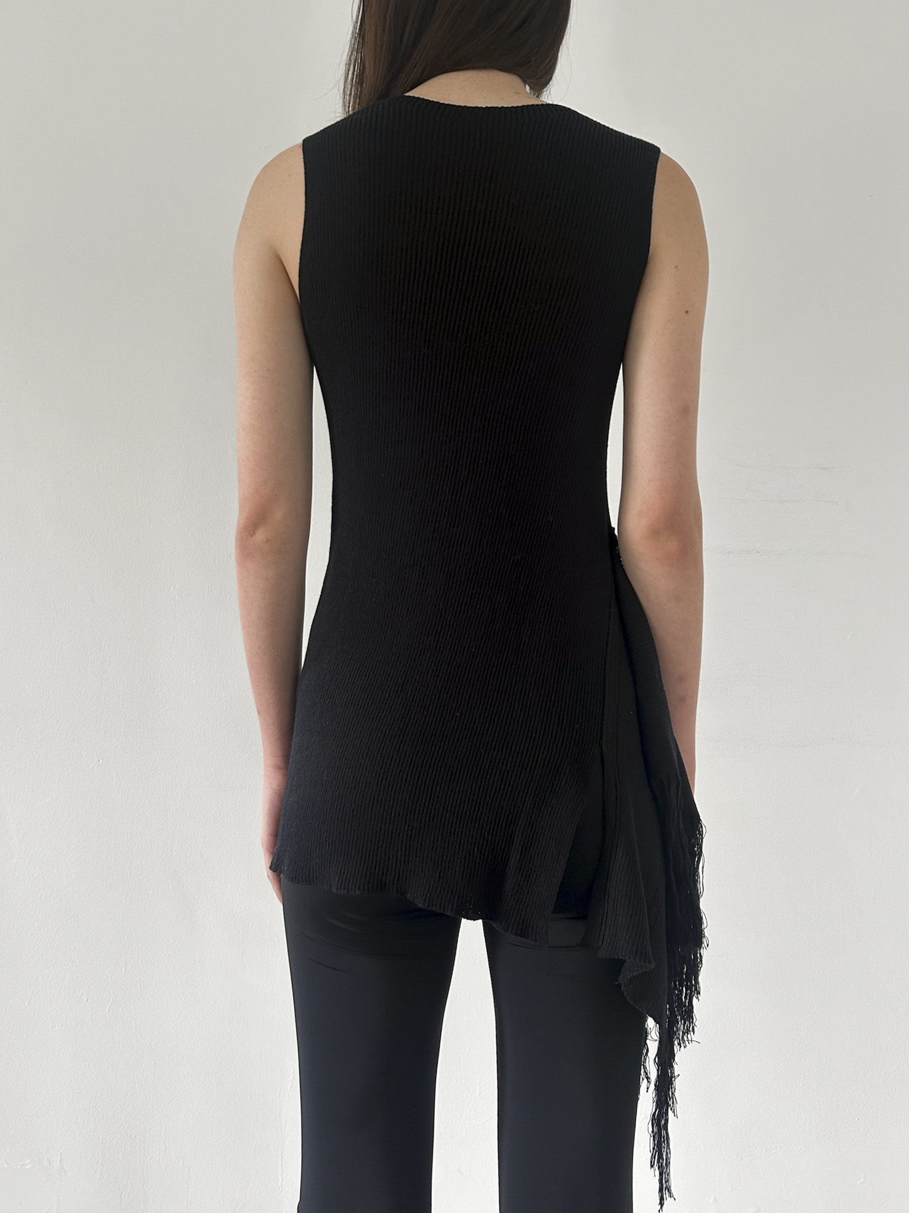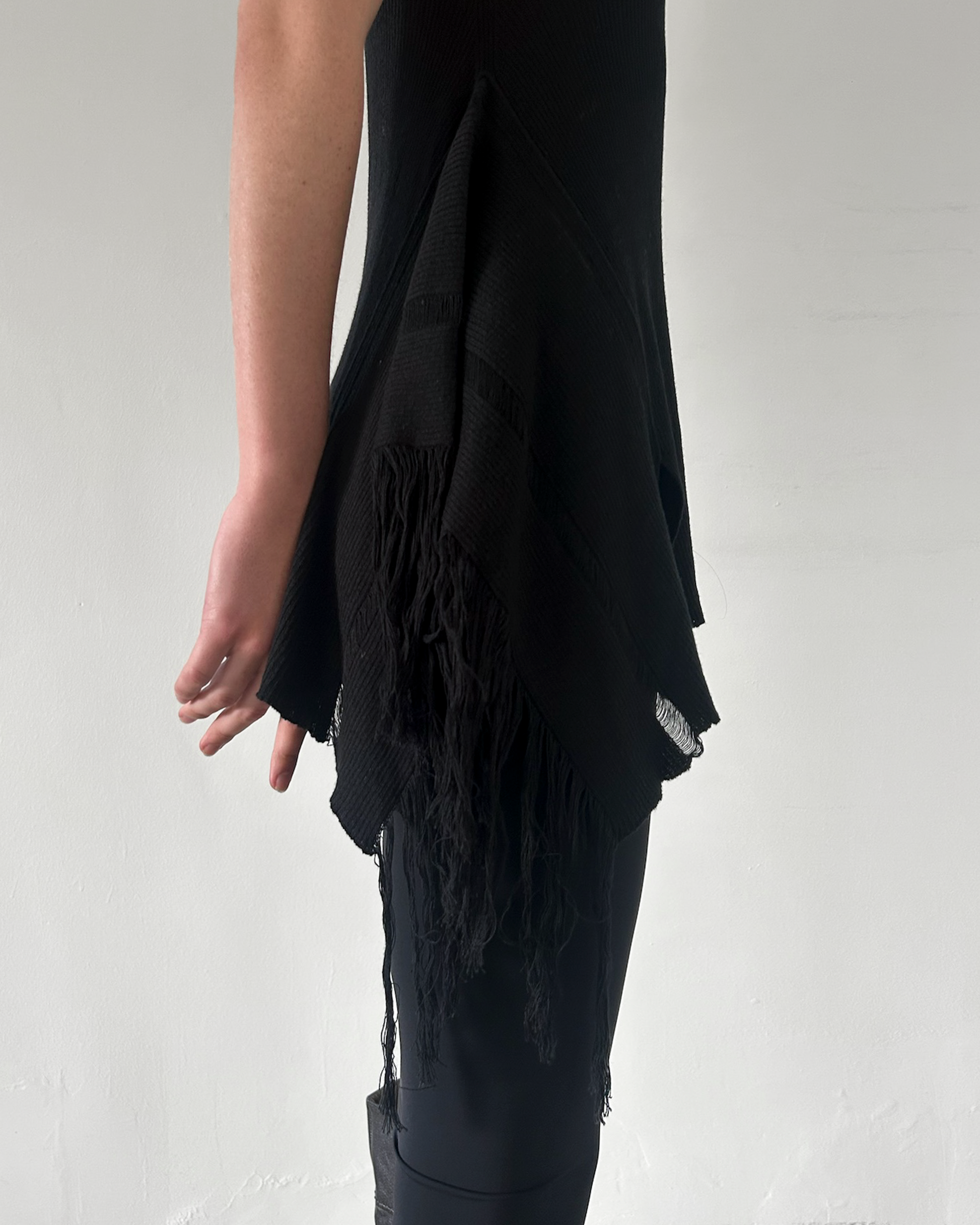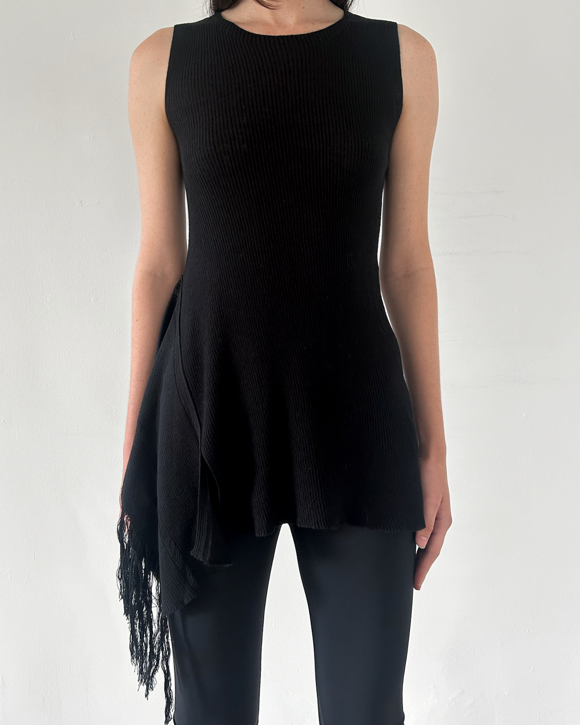 Y’s Yohji Yamamoto black asymmetrical sleeveless sweater tunic with side fringe detail